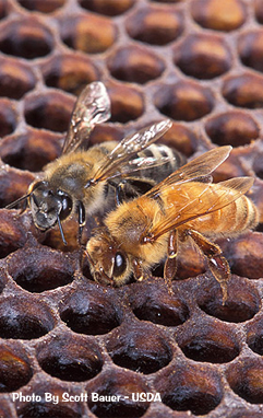 An Africanized honey bee (left) and a European honey bee on honeycomb. Despite color differences between these two bees, mostly they can’t be identified by eye.